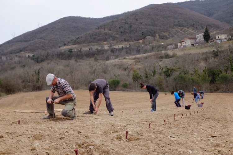 2 jours complets à les répartir, les enfoncer avec une « fourchette » dans une terre délicatement travaillée en amont, et les arroser en guise de prière pour l’avenir.